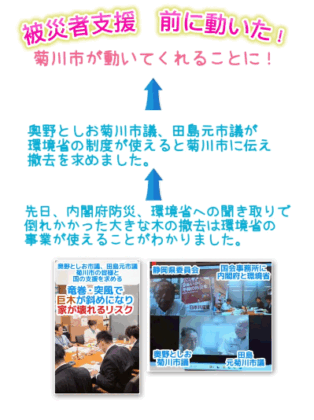 竜巻・突風で倒れかかった大きな木。家が潰れる危険性がある問題で、一緒に内閣府防災、環境省からの聞き取りを行った奥野としお菊川市議、田島ちかお元菊川市議が、菊川市に環境省の制度が使えることを伝えてくださる中で、菊川市が動い ... 続きを読む →