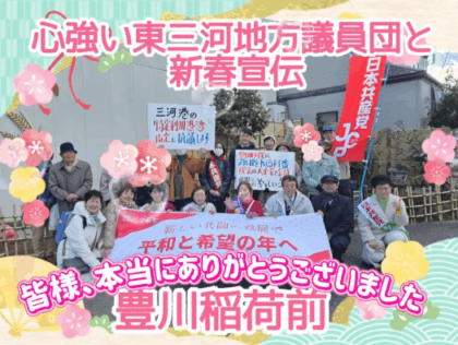 豊川稲荷(愛知県豊川市)で新春宣伝 しもおく奈歩愛知県議、安間ひろこ豊川市議、佐藤郁恵豊川市議、斎藤ひろむ豊橋市議、鈴木みさ子豊橋市議、中西みつえ豊橋市議、 浅尾洋平新城市議、白頭きよし新城市議、浅尾もとこ東栄町議、 ... 続きを読む →