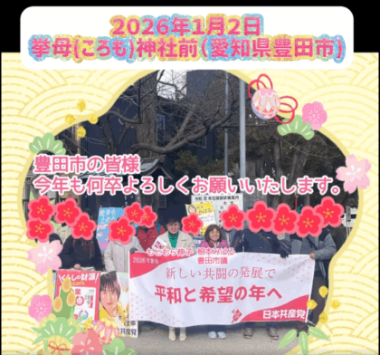 2026年1月1日、戦争させない、平和と暮らしの希望をつくる決意をし、熱田神宮前(名古屋市熱田区)、真清田神社前(愛知県一宮市)で新春宣伝を行いました。 熱田神宮前には、すやま初美党県副委員長、しばぐち征寛高浜市 ... 続きを読む →
